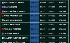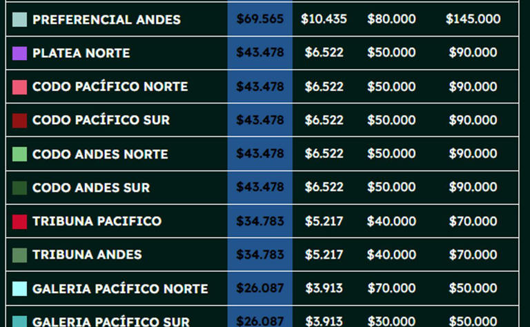La venta de entradas está disponible a través del sistema PuntoTicket, con precios que van desde $20.000 diarios (Galería Andes) hasta $180.000 por un abono (Los dos días) Preferencial Pacífico. Conoce el detalle completo a continuación:En caso de ganar, el combinado nacional avanzará a la segunda ronda clasificatoria, que se realizará en septiembre.
